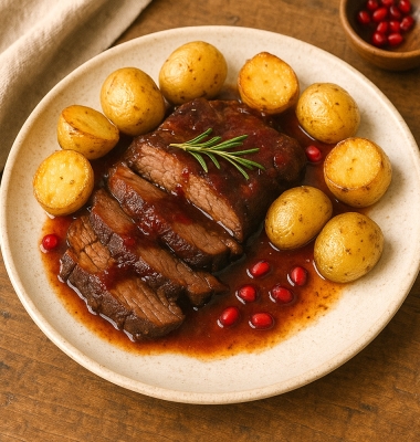 Brisket with Pomegranate-Cranberry Glaze and Roasted Garlic